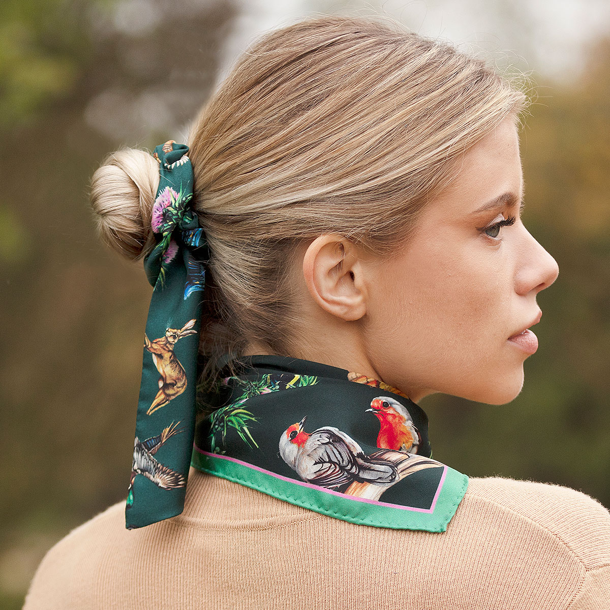 My hair accessories gave a multitude of uses. The tail detaches so you can wear the scrunchie on it’s own and then tie the scarf to your handbag, round you wrist, or with the long one it can be worn as a headband.